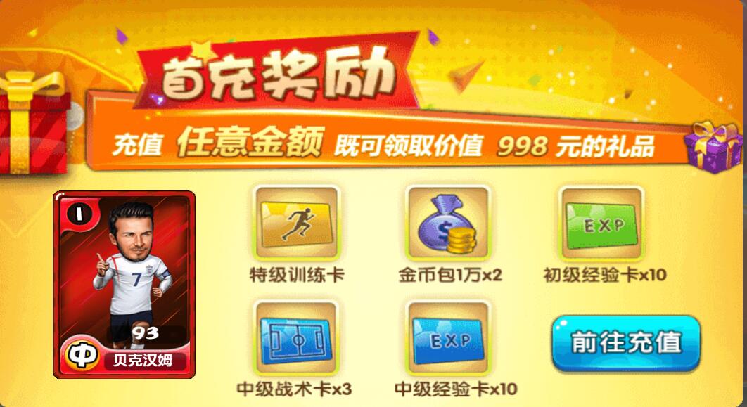 礼包内容:中场球员贝克汉姆卡*1,特技训练卡金币包1万*2,初级经验卡*10,中级战术卡*3,中级经验卡*30。