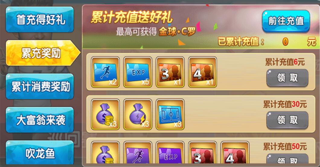 毋容置疑,首充是每款游戏中最划算的一次充值,也是检验大家是否值得玩这款游戏的关键所在,《足球经理H5》的首充活动可以说是十分豪华了,首充任意金额即可领取价值998元的超值大礼包。
