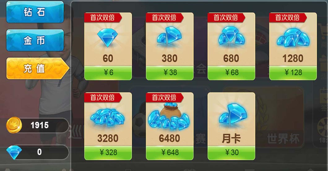 首次充值可以获得双倍的钻石。6元=60钻石;38元=380钻石,68元=680钻石;128元=1280钻石,328元=3280钻石,648=6480钻石。